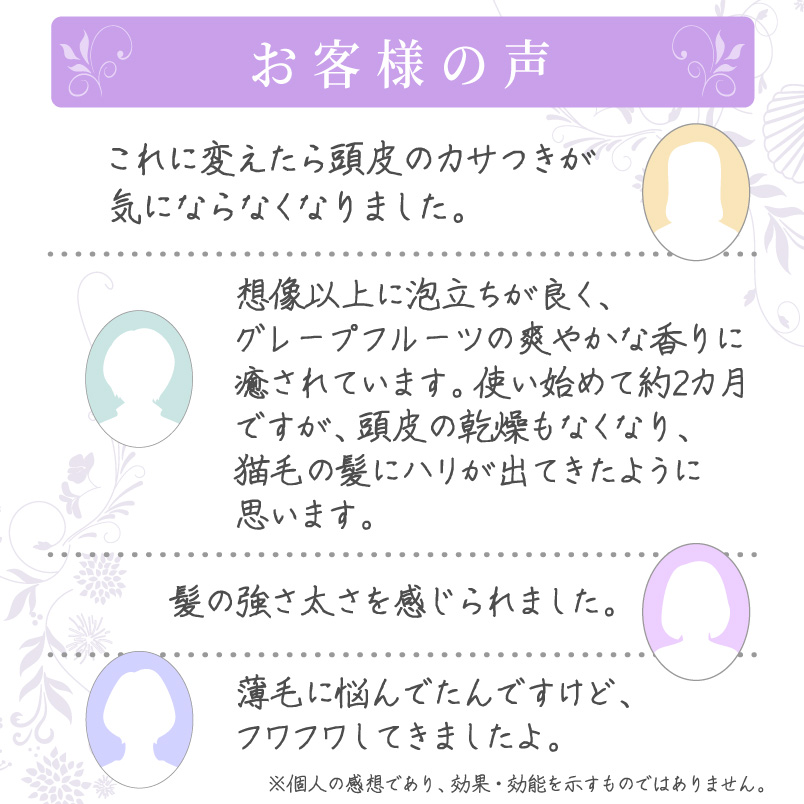 ぬるま湯で予備洗いをしたあと、泡立ててから髪にのせ、指の腹で頭皮をマッサージするように洗ってください。